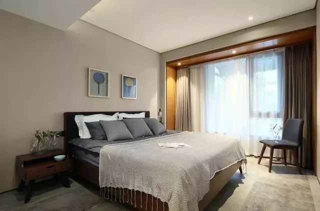 灰白床铺,搭配温暖的原木,营造温馨恬静的休息氛围,窗边的沙发椅,留给主人享受独处时光。