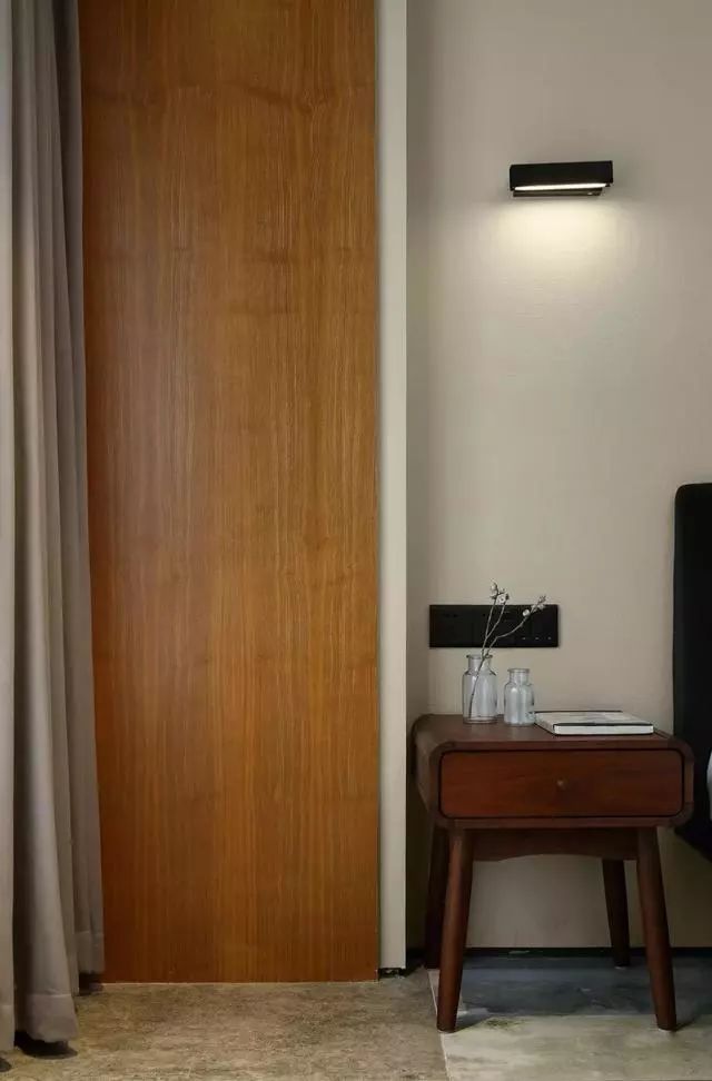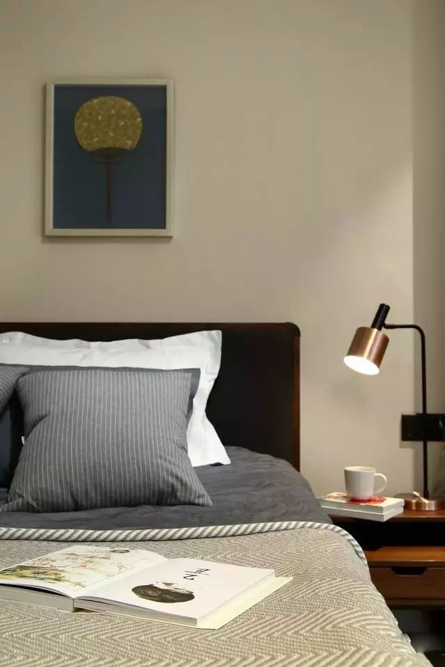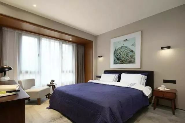 米色的床头背景墙上挂上衣服白边的装饰画,黑色长方体壁灯散发着温暖的光,凳子上的小河马压书器在阳光下向你招手。深蓝色的床单,搭配白色的抱枕,让空间显得宁静而优雅。