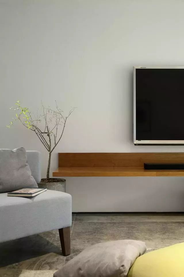 电视机直接挂在墙上,长方形的悬空电视柜,用来放置装饰品,简洁而优雅大方。