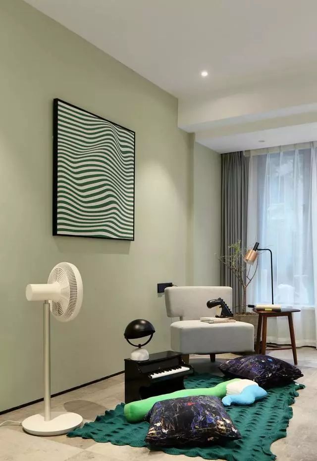 黑色小巧的儿童钢琴,绿色的地毯,白色的落地风扇,可爱的玩偶,都为这小小的休闲区增添了一丝趣味性,使得娱乐性十足。