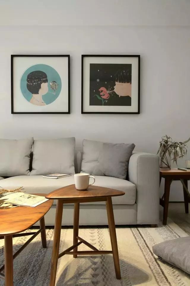 木艺的三角弧形茶几,搭配背景墙上有趣的挂画,与主题风格相呼应,营造舒适的待客空间。