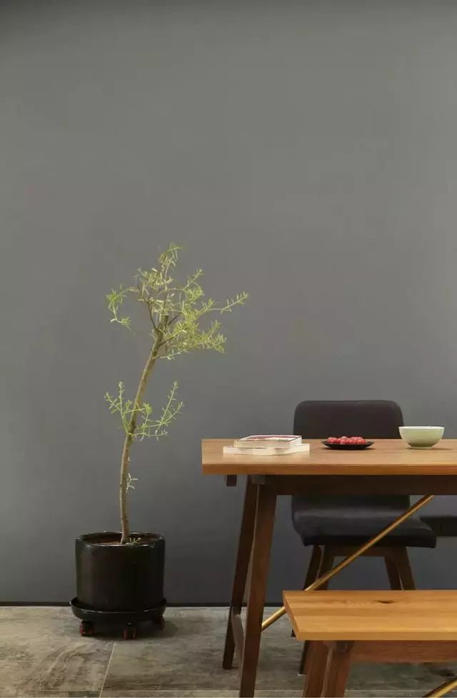 方寸之地亦显天地之宽。灯、桌、椅、盆栽、碗、浅灰的墙壁,构成含蓄而内敛、简单而安闲的餐厅环境。